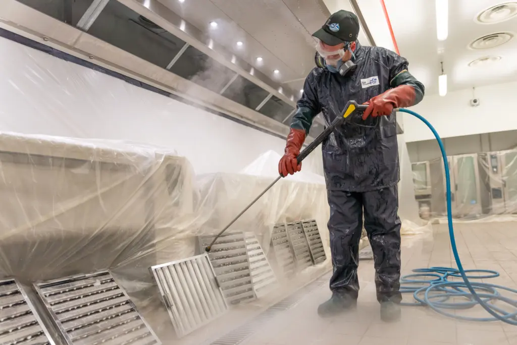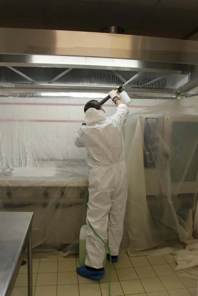 Nettoyage complet et minutieux de la hotte. L’installation est désormais propre et conforme aux exigences d’hygiène.